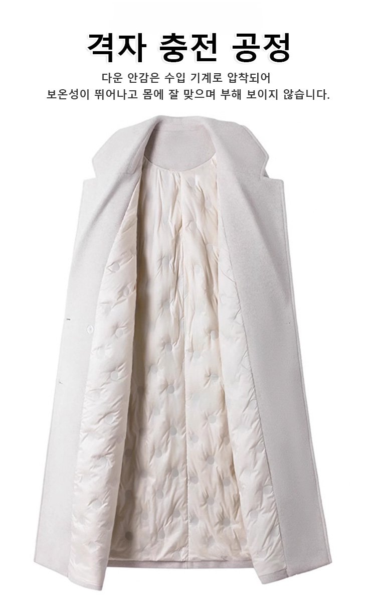 100% 호주산 울, 90% 화이트 구스다운 내장! 영하 30도에서도 따뜻하고 우아하게.